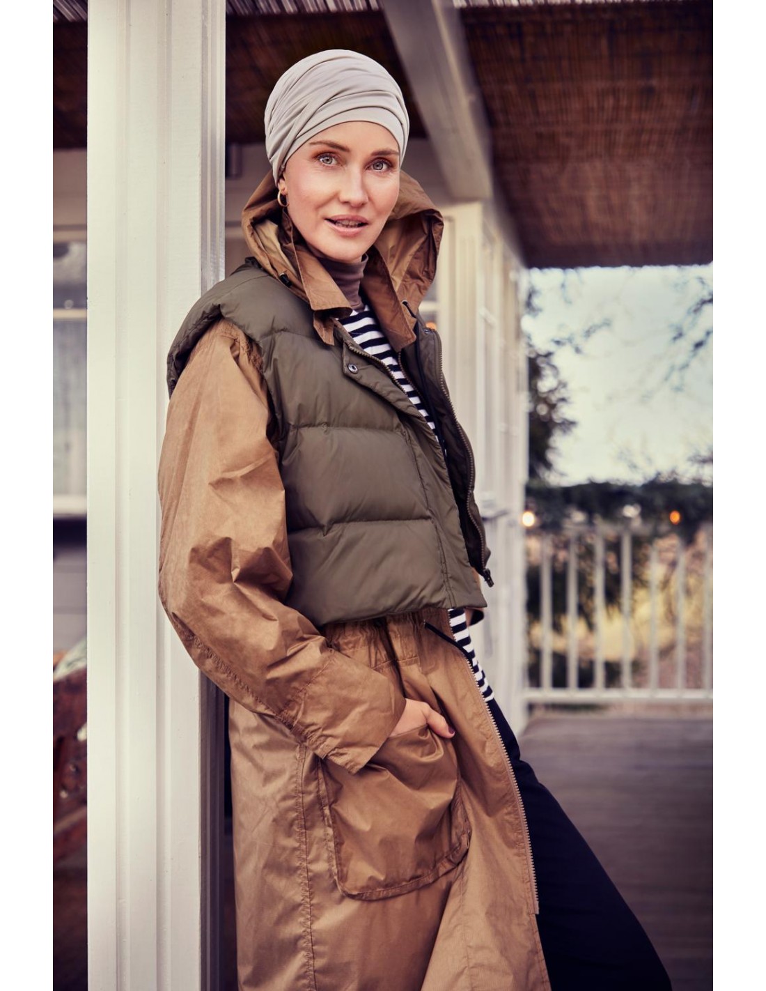 Turbante oncológico Nomi en algodón Supima y spandex. Diseño clásico con acabado "baggy" en la nuca, suave, cómodo y fácil de colocar.