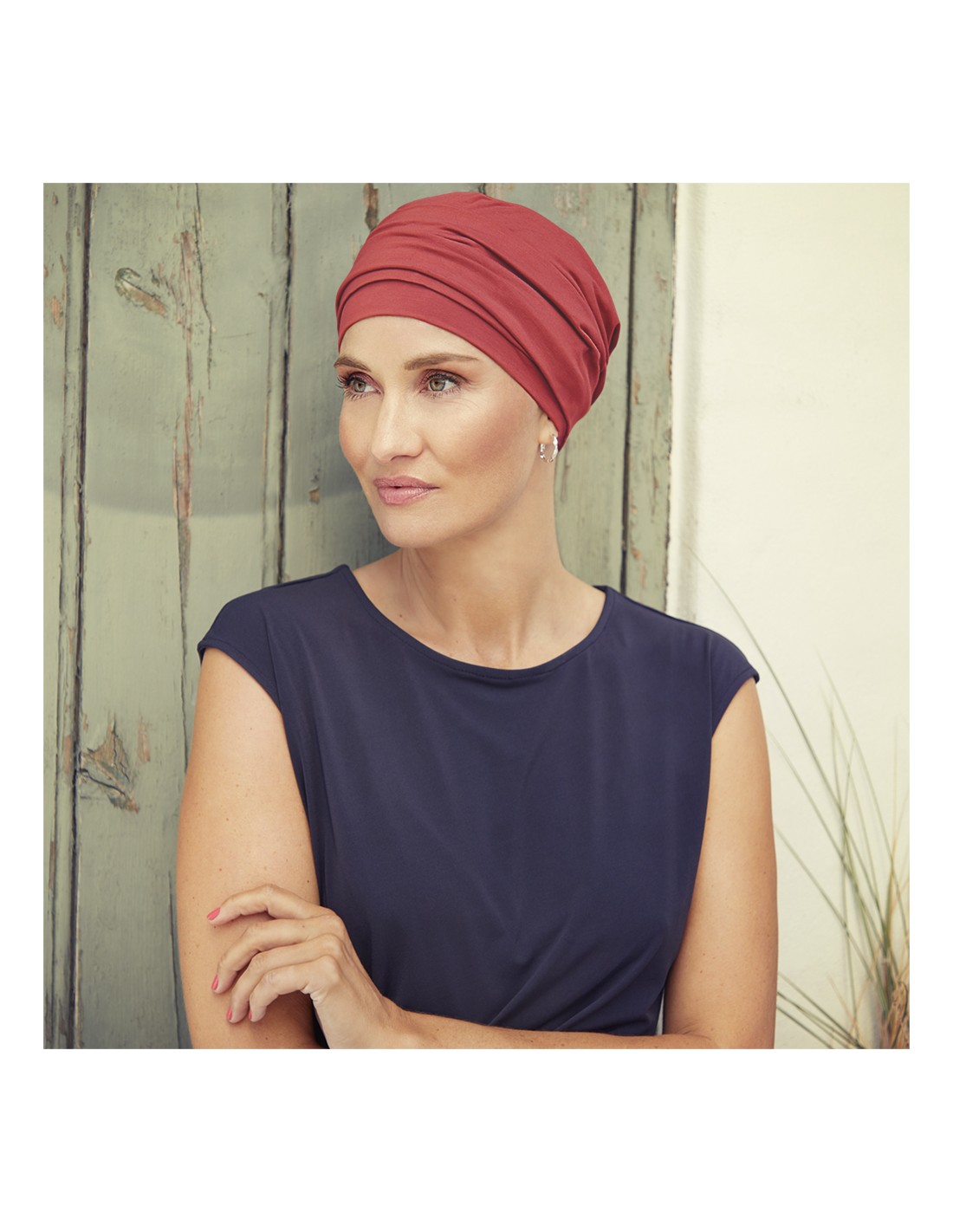Turbante oncológico Nomi en algodón Supima y spandex. Diseño clásico con acabado "baggy" en la nuca, suave, cómodo y fácil de colocar.