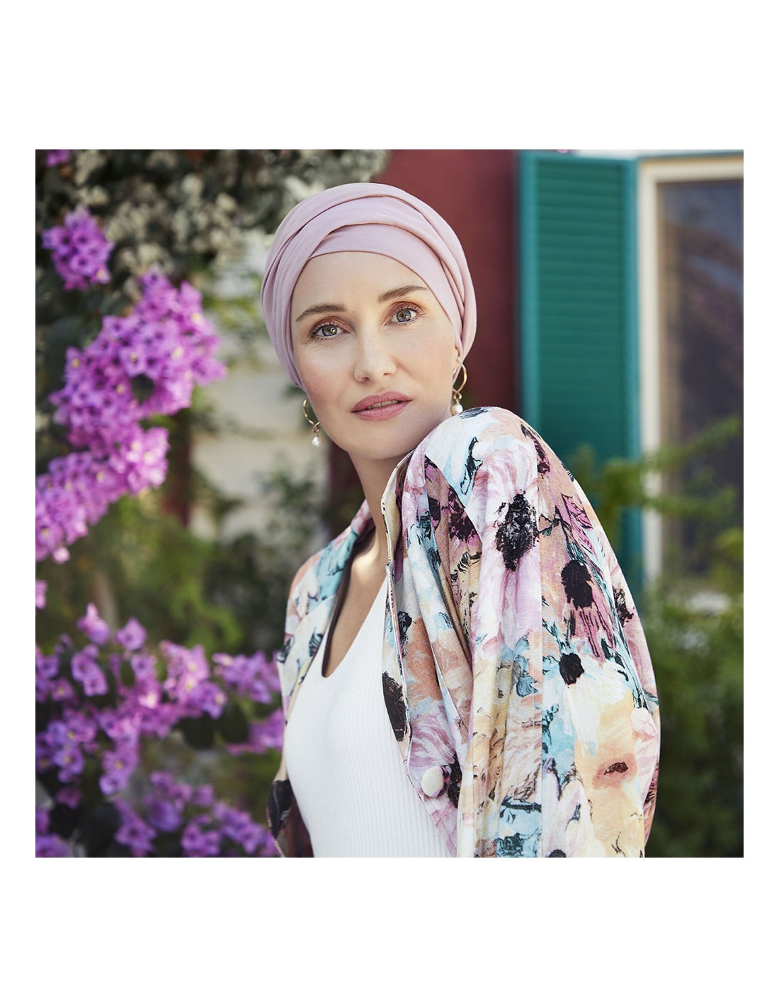 Turbante oncológico Nomi en algodón Supima y spandex. Diseño clásico con acabado "baggy" en la nuca, suave, cómodo y fácil de colocar.