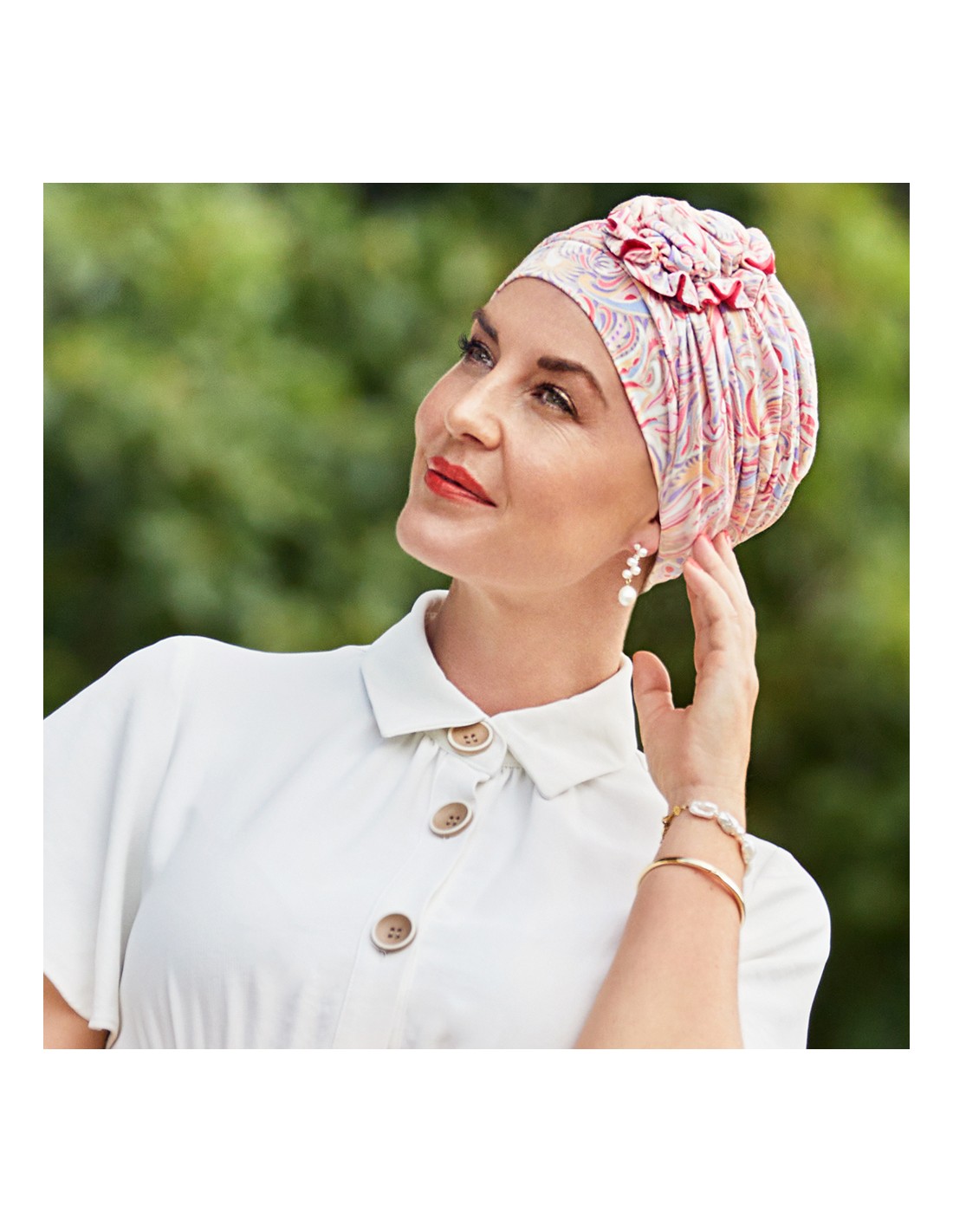 Turbante oncológico de bambú-viscosa ultra suave y transpirable con detalle floral decorativo que aporta volumen. Disponible en varios estampados para elegir tu estilo.