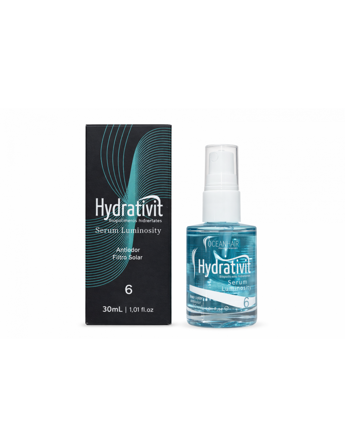 Ocean Hair Hydrativit Serum Luminosity es un sérum capilar iluminador formulado para aportar brillo intenso, suavidad y un acabado sedoso al cabello. Su fórmula con biopolímeros hidratantes crea una película protectora ligera que ayuda a retener la hidratación, mejorar la textura del cabello y protegerlo frente a las agresiones externas.
