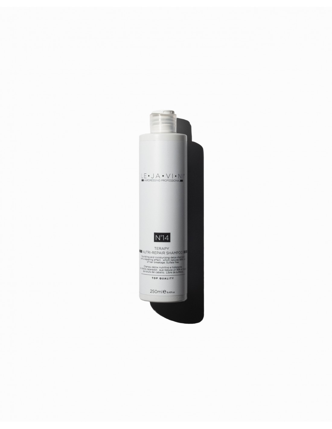 El Nº14 THERAPY NUTRI-REPAIR SHAMPOO 250ml de LE·JA·VI·NI es un champú nutritivo reparador diseñado para cabellos tratados químicamente y decolorados. Su fórmula avanzada proporciona una limpieza profunda mientras hidrata y nutre la fibra capilar, reduciendo el riesgo de rotura hasta en un 98% cuando se combina con la mascarilla Nº15.