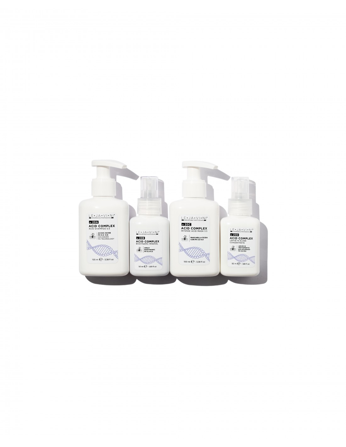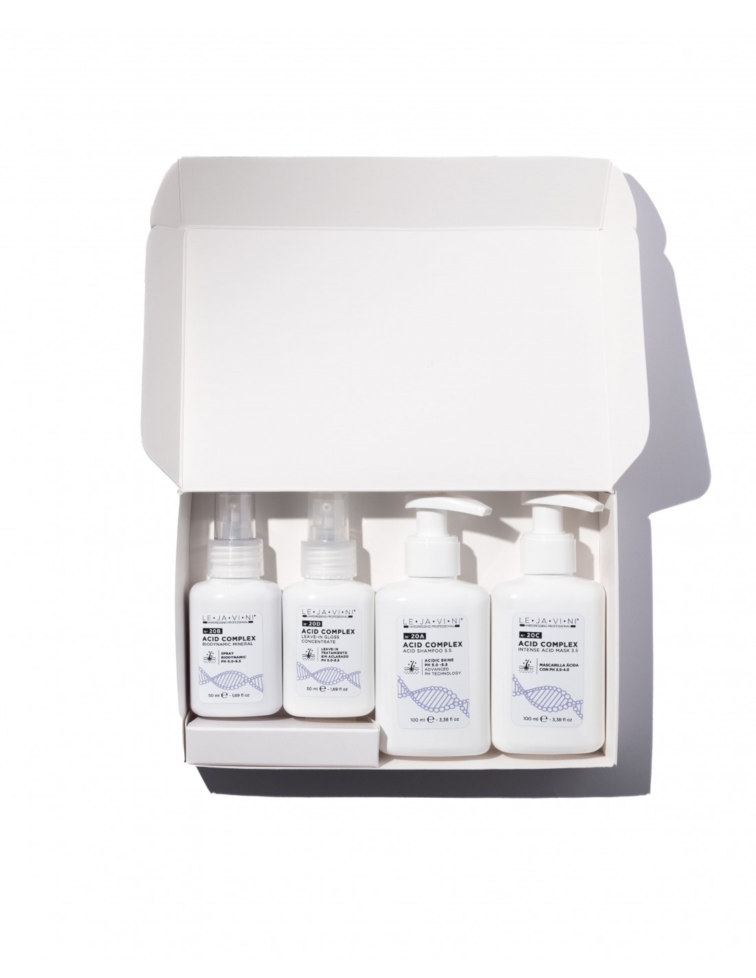 El kit reconstrucción ácido complex cabello LE·JA·VI·N está diseñado para restaurar y fortalecer la fibra capilar dañada por tratamientos químicos como alisados, coloraciones, decoloraciones o permanentes. Su exclusiva tecnología Acid Complex reconstruye los enlaces debilitados, aportando fuerza, elasticidad y resistencia a la fibra capilar.