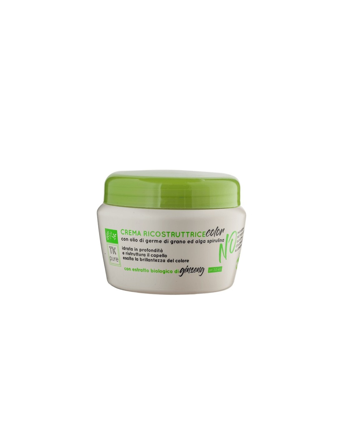 Crema Ricostruttrice Color 250 ml TK Pure con extracto de ginseng orgánico. Hidrata profundamente y reestructura el cabello. Realza el brillo del color.